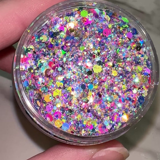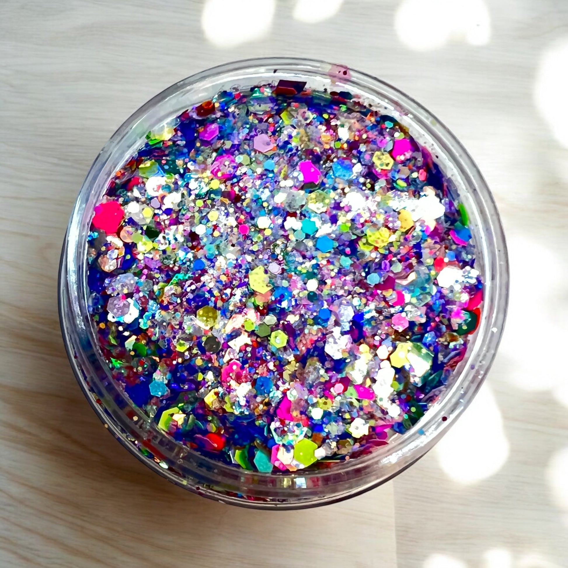 GLITTER COMES IN A 1 OZ JAR, AND IS PACKED BY VOLUME, NOT WEIGHT, MEANING THAT EACH JAR IS FILLED TO MAXIMUM CAPACITY, RATHER THAN WEIGHED. OUR GLITTER MIXES ARE LIMITED RELEASES.