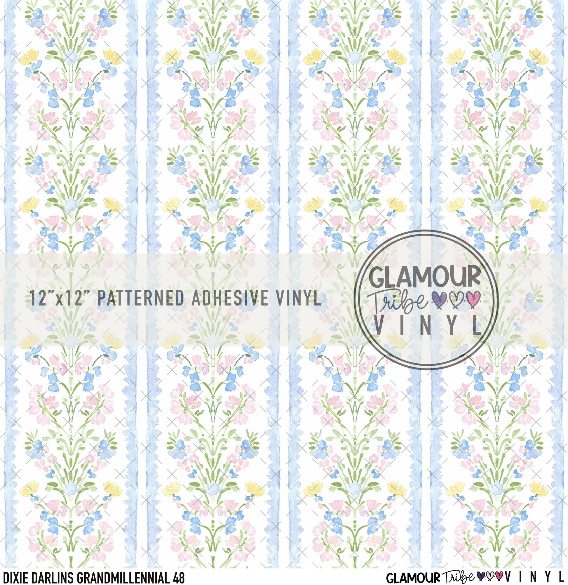 12"x12" sheet fully opaque pattern printed on white adhesive vinyl. See our available vinyl type options below, along with their descriptions. Usable, printed area of the print is a full 12"x12".