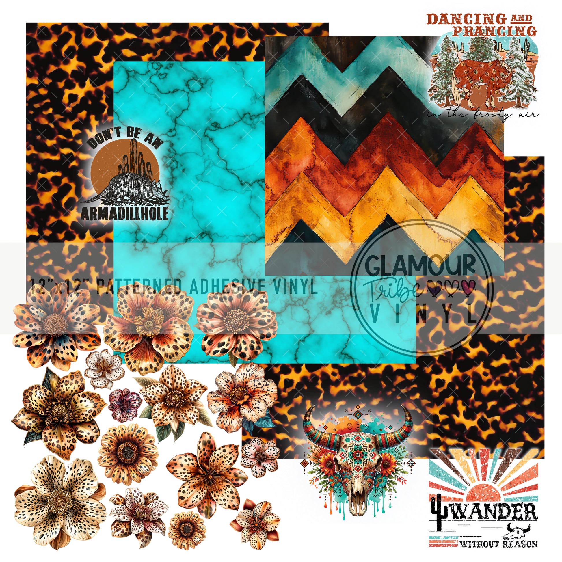 12"x12" sheet fully opaque pattern printed on white adhesive vinyl. See our available vinyl type options below, along with their descriptions.